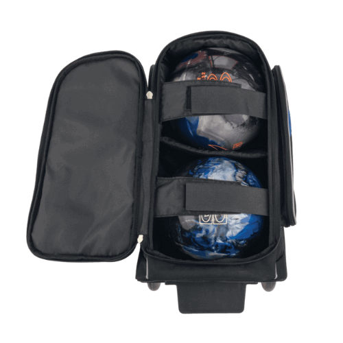 The Brunswick Charger Double Roller Bowling Bag has lots of features you will love! This bag is equipped to conveniently carry 2 bowling balls with a large front shoe compartment, larger sized zippered accessory pouch, plus 3″ molded groove plastic wheels!