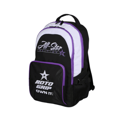 This New Roto Grip All-Star Edition backpack is great for carrying extra supplies to the lanes, school, the gym, on a hike, or just wherever you need to carry stuff without tying up your hands! Color: Black/White/Purple Does NOT hold a bowling ball 600D polyvinyl material Reinforced zippers and stitching 3 Separate Compartments Plus Interior Pockets for Organizing Dual-side mesh water bottle pockets Adjustable shoulder straps Easy-Carry Top Handle Approx. Dimensions: 12″ W x 8″ D x 20″ H 90 day limited manufacturer’s warranty